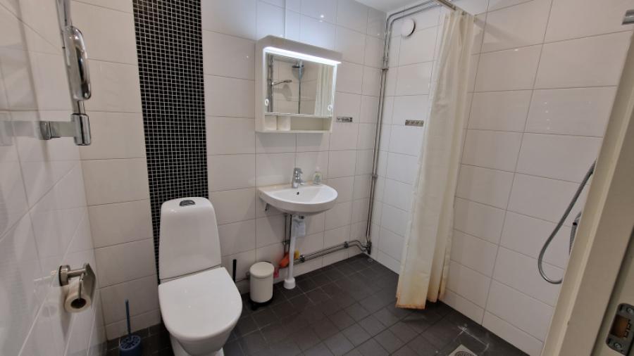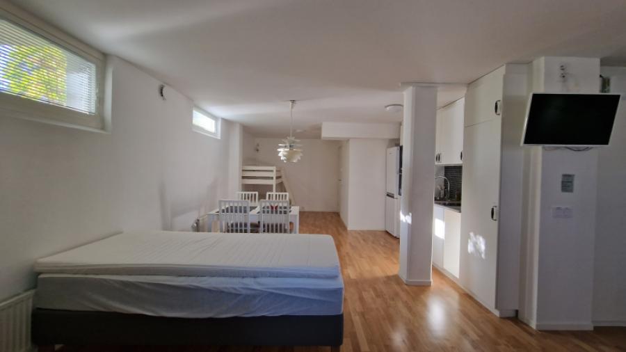 Gästlägenheten består av ett stort rum med två bäddar, bäddsoffa och två hopfällbara sängar. Pentryt är utrustat för frukost (matlagning är inte tillåten) med s.k. Trinettkök (två plattor diskbänk och kylskåp) samt kaffebryggare och porslin. Duschrum finns med WC och tvättställ.
