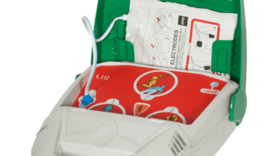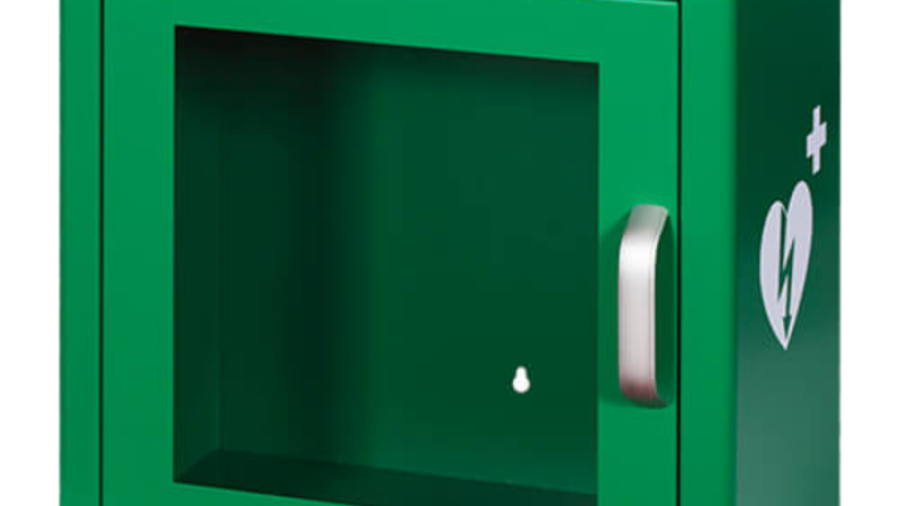Hjärtstartaren sitter i ett larmat skåp - när du öppnar skåpet larmar det men tystnar när du stänger skåpet igen.